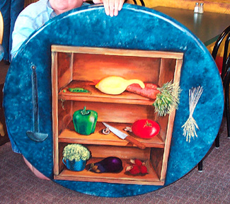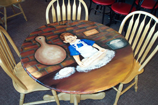 Two tables have been painted and coated with two more are to be completed. These tables line the center aisle of the restaurant.
